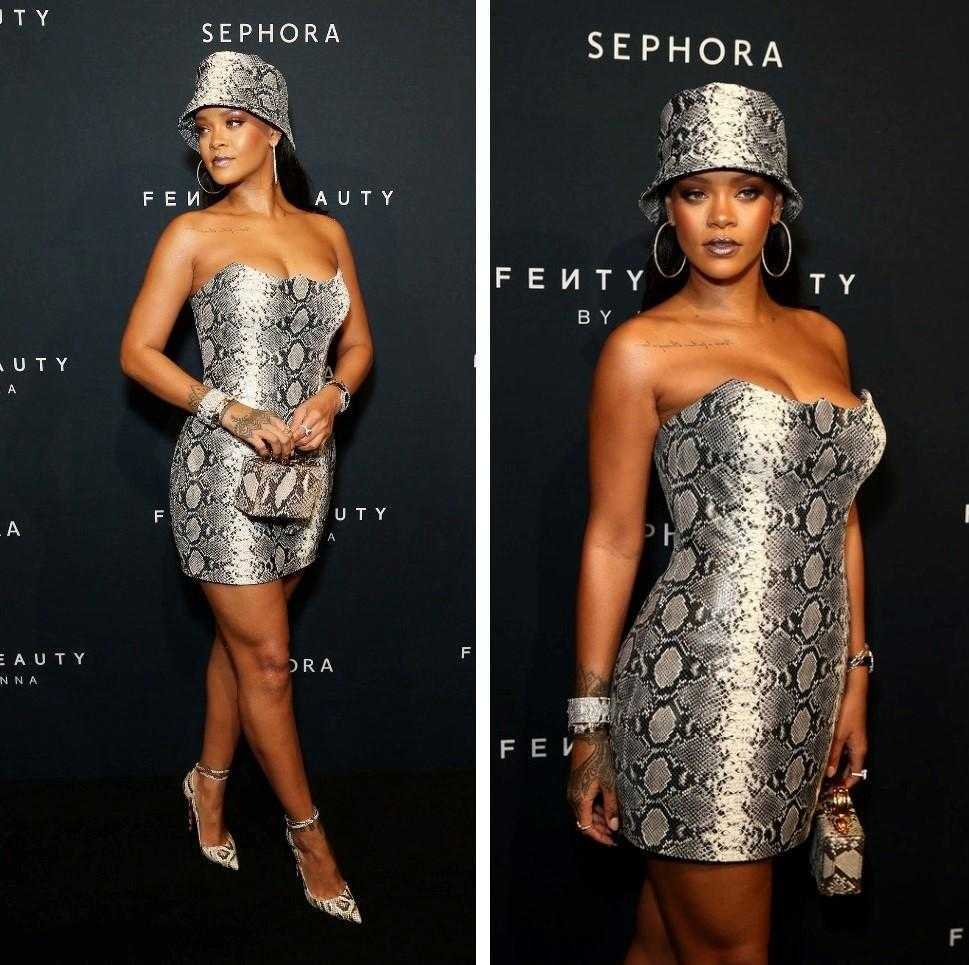 Правило «Или декольте, или короткая длина» не для Рианны: она запросто может примерить максимально провокационное короткое платье-бюстье с агрессивным хищным принтом. Но заметьте, как лаконично оно смотрится на ней.