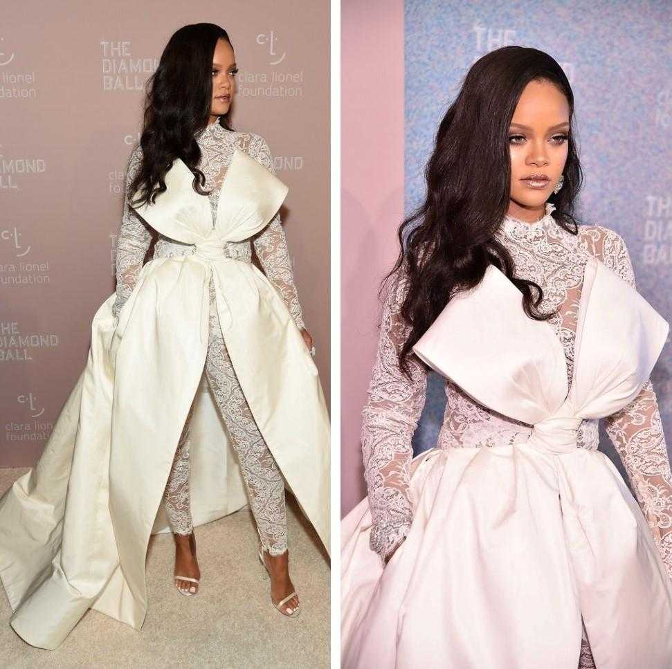 Один из самых эффектных образов Рианна продемонстрировала в прошлом году на красной ковровой дорожке Бала Института костюма. Лаконичный белый комплект из кроп-топа с открытой спиной и длинными рукавами, а также юбки прямого кроя в пол с эффектным шлейфом от Stella McCartney певица дополнила классическими белыми лодочками на каблуке от Christian Louboutin и крупными бриллиантовыми украшениями от Jacob & Co. и Dionea Orcini.