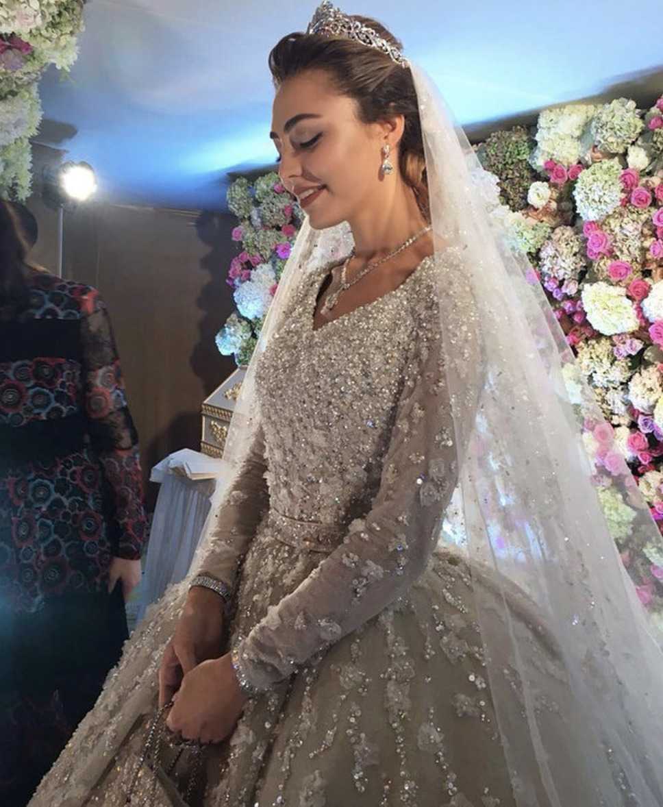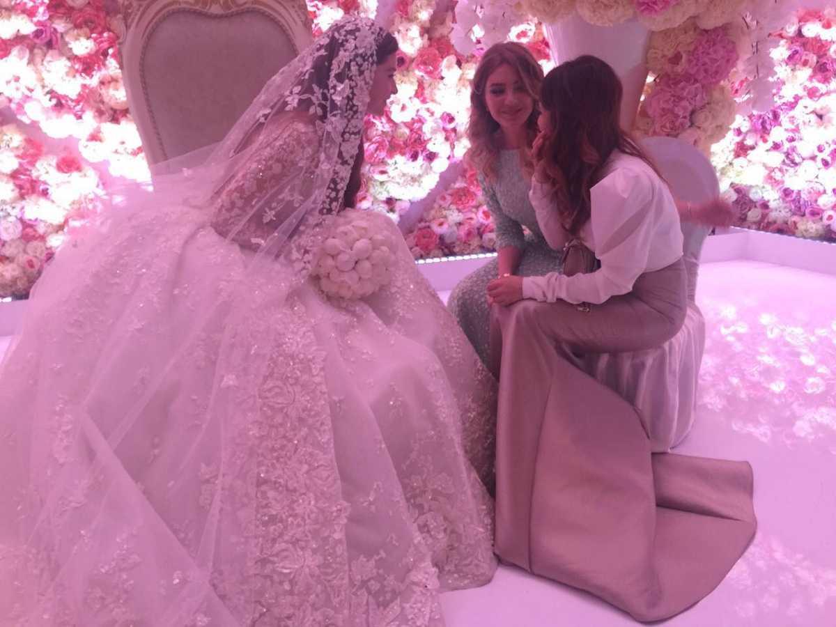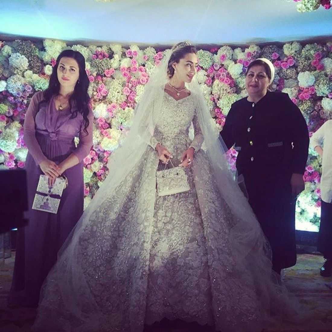 Невеста была одета в 25-килограммовое платье от ливанского дизайнера Elie Saab, украшенное длинным шлейфом и драгоценными камнями. По подсчетам экспертов, оно могло обойтись молодоженам в 25 миллионов рублей.