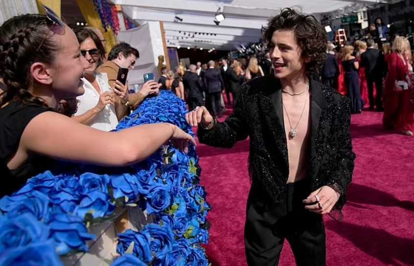 Шаламе надел по этому случаю, черный блестящий блейзер от «Louis Vuitton», прямиком на голый торс, много шутил и общался с поклонницами. Однако любители моды отметили странный курьез в стильном луке киноактера — вышеназванный блейзер, был на Неделе моды в Париже в марте 2022 года.