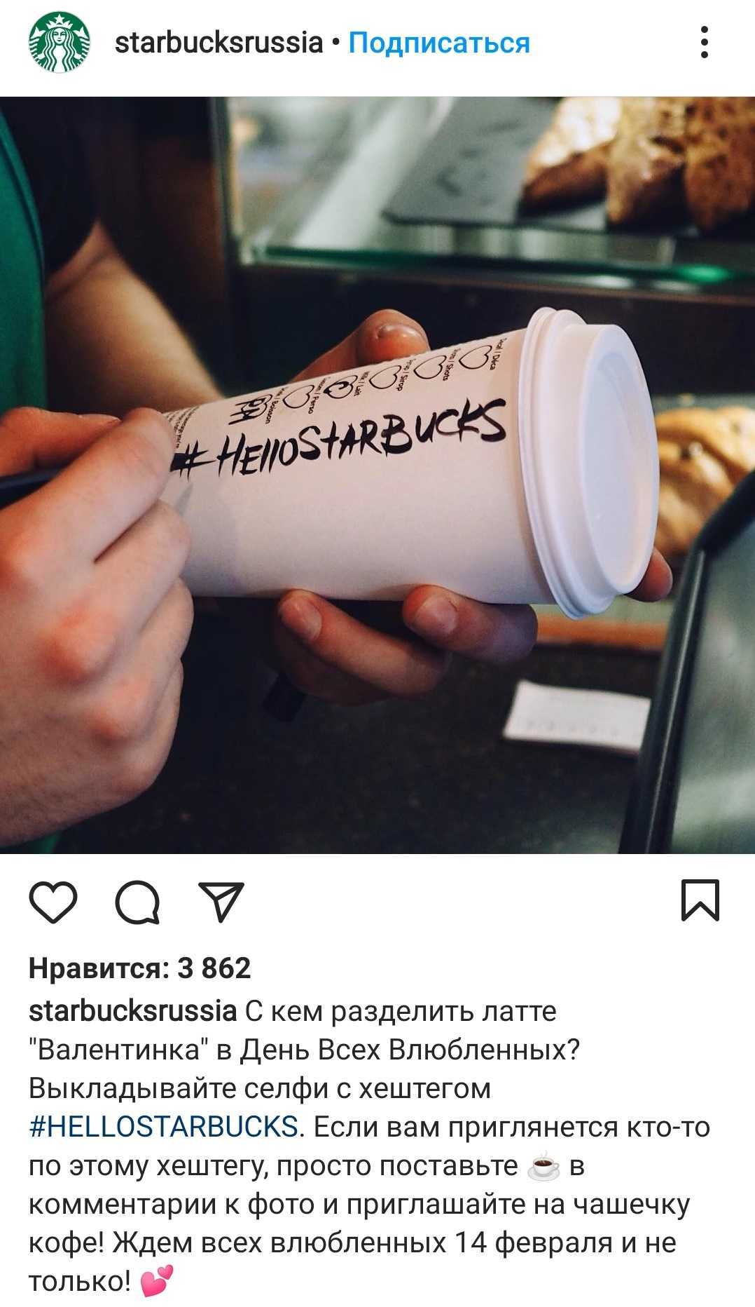 А в 2016 году сеть кофеен Starbucks запустила в Instagram акцию для людей без пары. Те, кому не с кем было отметить праздник, могли опубликовать селфи с хэштегом #hellostarbucks и по нему найти таких же одиноких людей. Чтобы познакомиться с человеком, который понравился, пользователи оставляли под его фотографией эмодзи с чашкой кофе — это было зашифрованным посланием, которое понимали только участники акции.