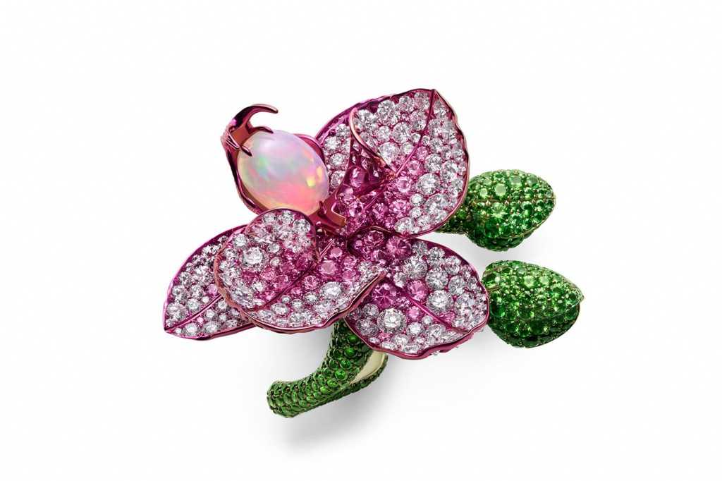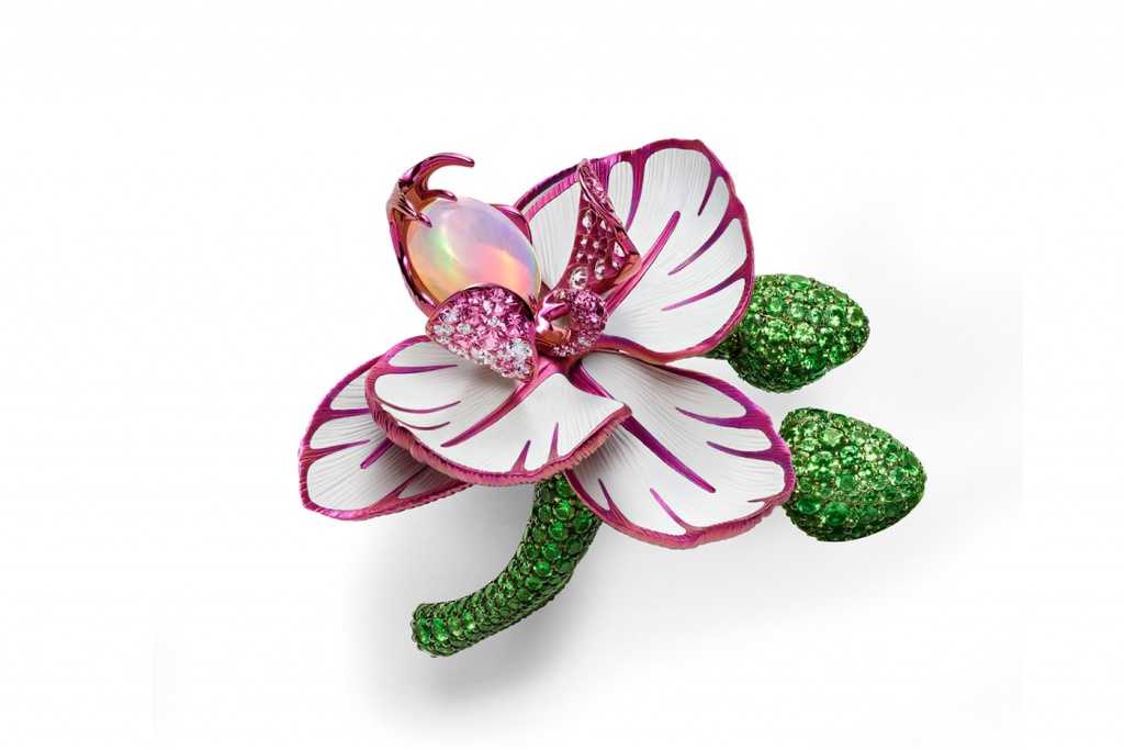 Брошь «Orchid Suite» Chopard из коллекции Red Carpet 2019 из титана с опалом, цаворитами, сапфирами и бриллиантами