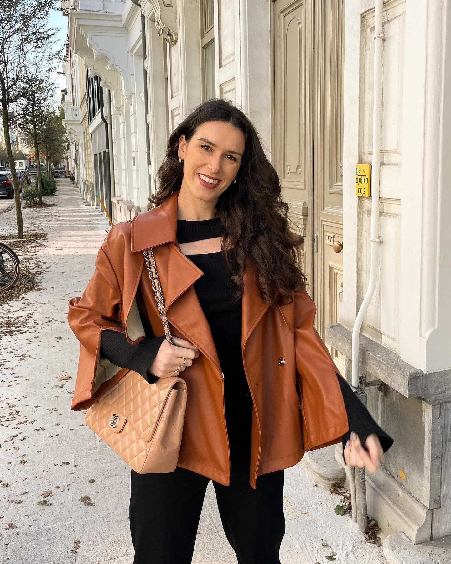 Также неплохо будет смотреться короткая кожаная курточка, как показано на фото выше. Осенний гардероб женщин за 30 включает в себя: