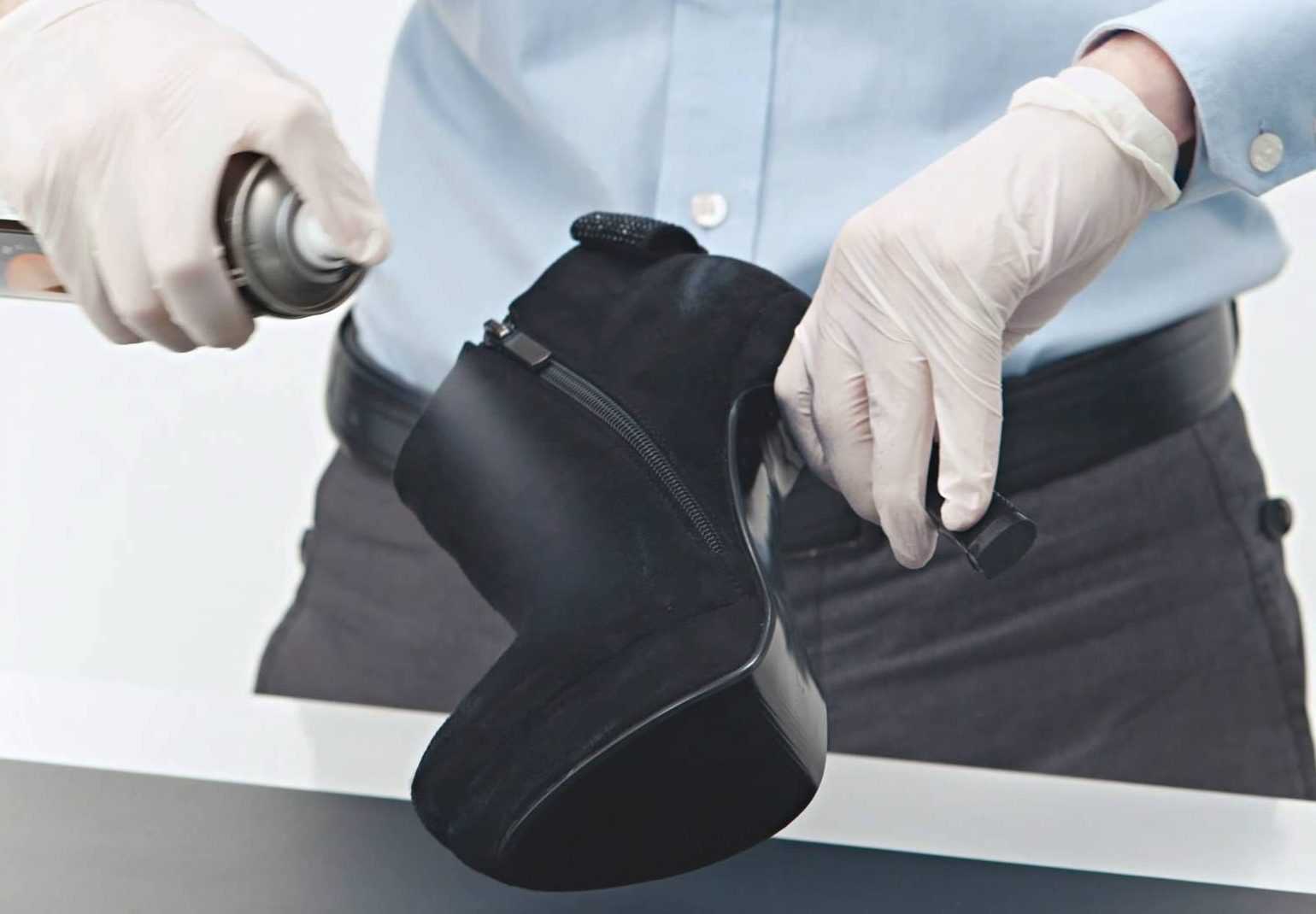 - Спиртосодержащие растворы. При помощи пульверизатора необходимо обильно обработать поверхность как снаружи, так и внутри, затем надеть туфли, походить в них до полного высыхания.
