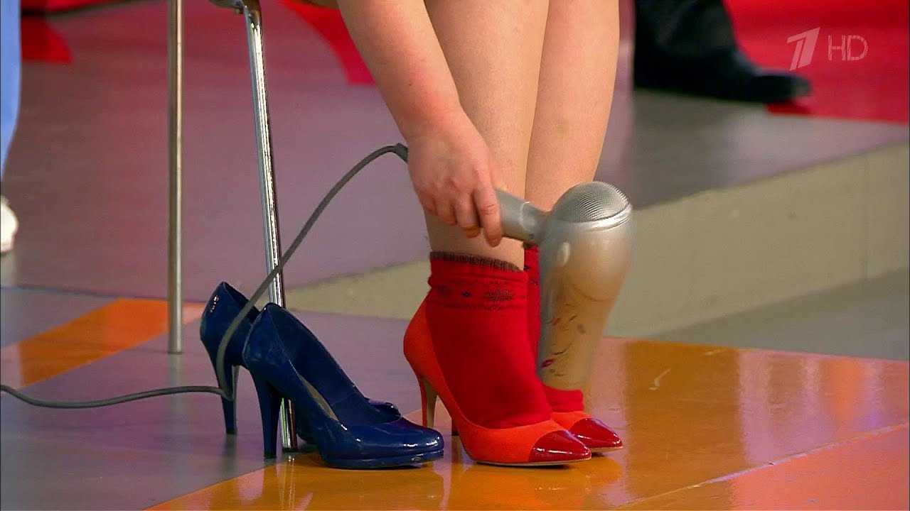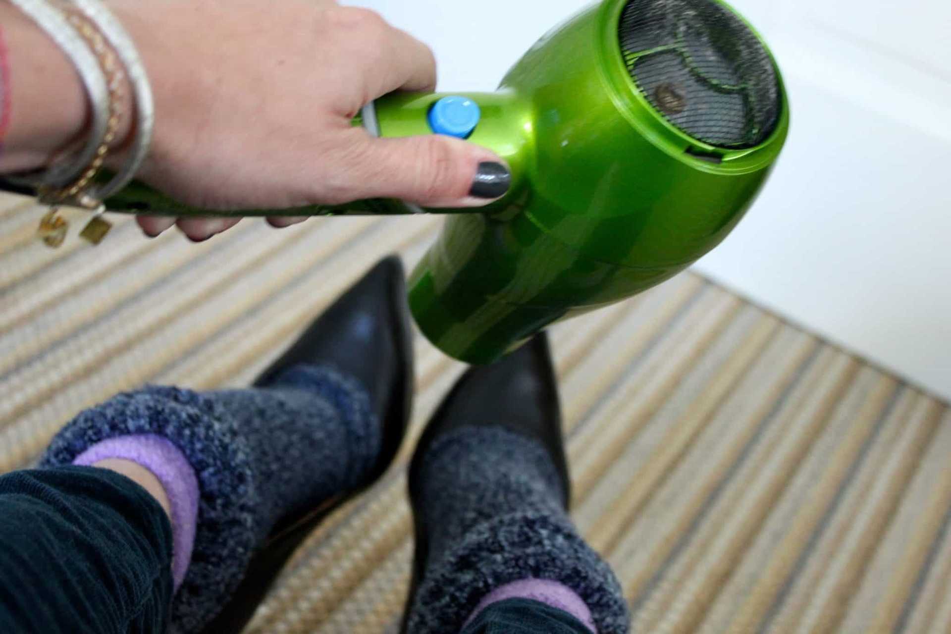 На ноги надевают толстые носки, а сверху – кожаную обувь. После этого нужно включить в сеть фен для сушки волос на режиме горячего обдува. Направить его стоит в ту сторону, где обувь жмет.