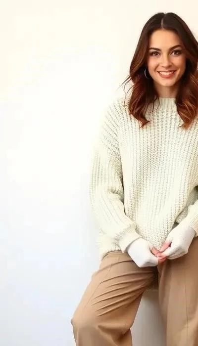 Одежда: Широкие брюки из мягкой ткани, кашемировый свитер оверсайз, удобные лоферы или кеды.