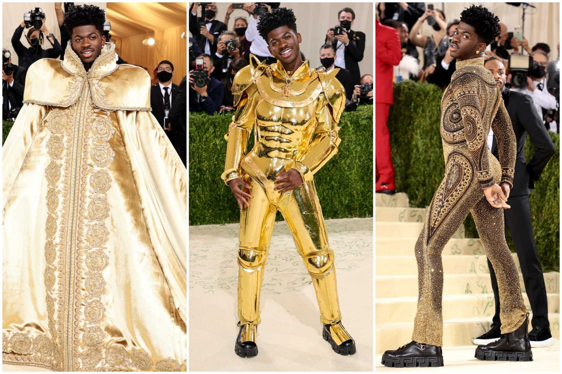 Отдельное место занимает выход Lil Nas X: появившись в роскошном образе Versace и затем скинув его, рэпер стал похож на C-3PO из «Звездных войн». Это еще не все. Сняв обмундирование, в черном комбинезоне, усыпанном золотыми стразами, Lil Nas X продолжил производить впечатление и получать восторженные возгласы фотографов.