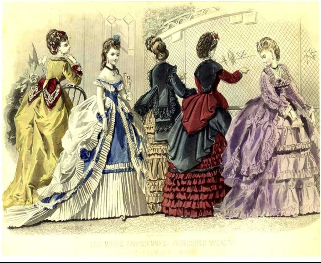 Мода позолоченного века — мода излишеств. Пышные платья, разные цвета, много материалов сразу, которые приправлены обильным количеством деталей в виде бантов, рюшек, бахромы, лент — вот типичные модные наряды того времени. Совсем скоро Коко Шанель все изменит, но пока царит корсет.