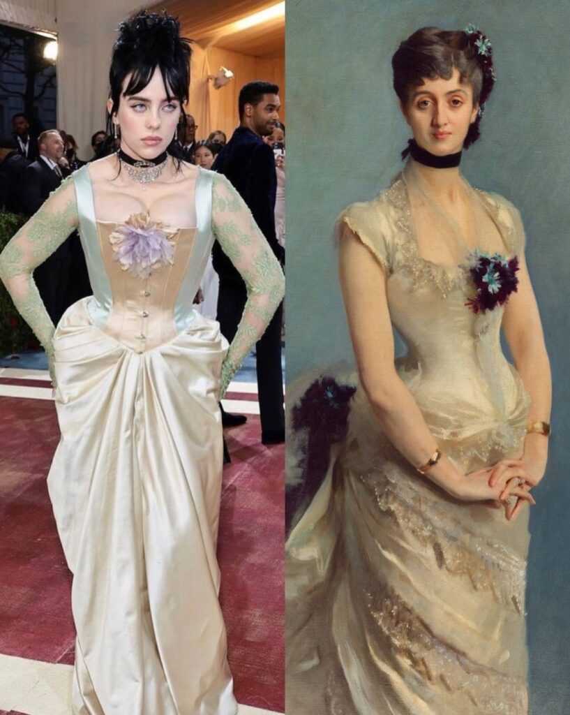 Билли Айлиш немного промахнулась с эпохой, повторив портрет Мадам Поль Пуарсон художника Джона Сингера Саржент. А еще многим показалось, что певице было в прямом смысле тяжело дышать. Похоже, все «прелести» карсета она испытала на себе. Зато Эмма Корин нашла оригинальный выход — повторила образ мужчины — миллиардера и «короля пижонов» конца 19 века Эвандера Берри Уолл.