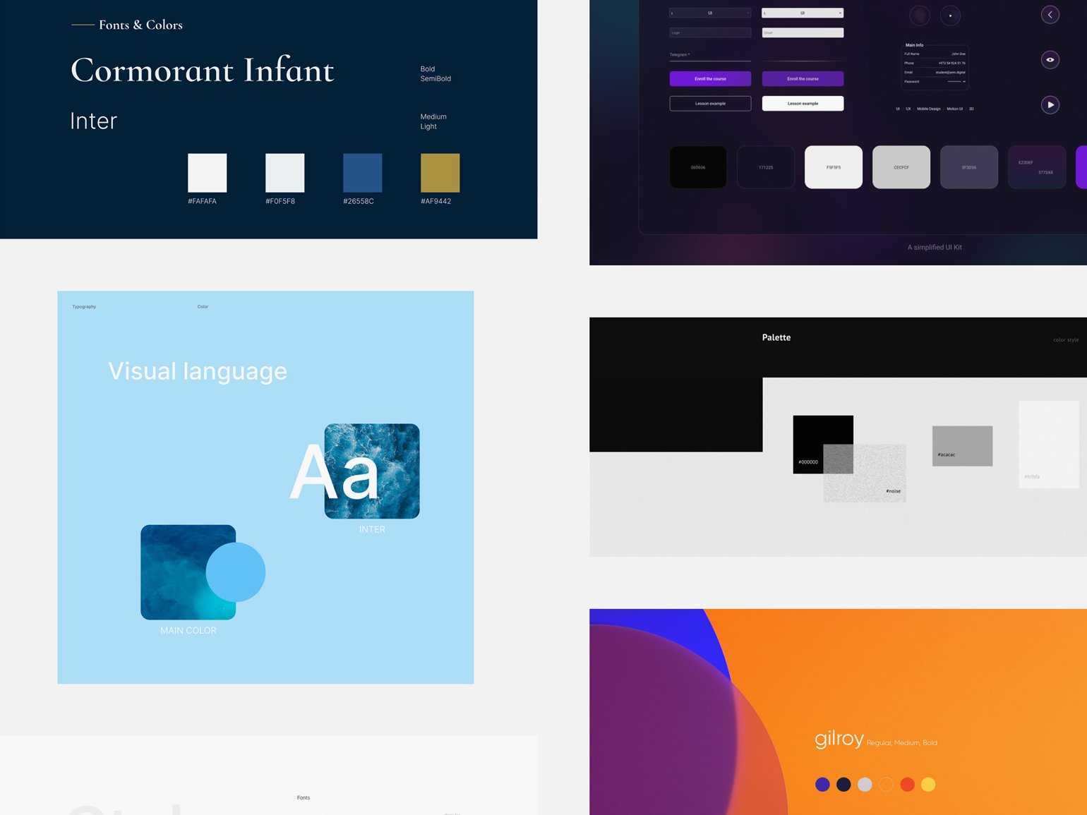 В блоках визуальных решений можно встретить наборы UI-элементов проекта, сетки композиции, выбор шрифтовых и цветовых сочетаний и тому подобное. Стоит дополнять такие блоки кратким объяснением показанных решений.