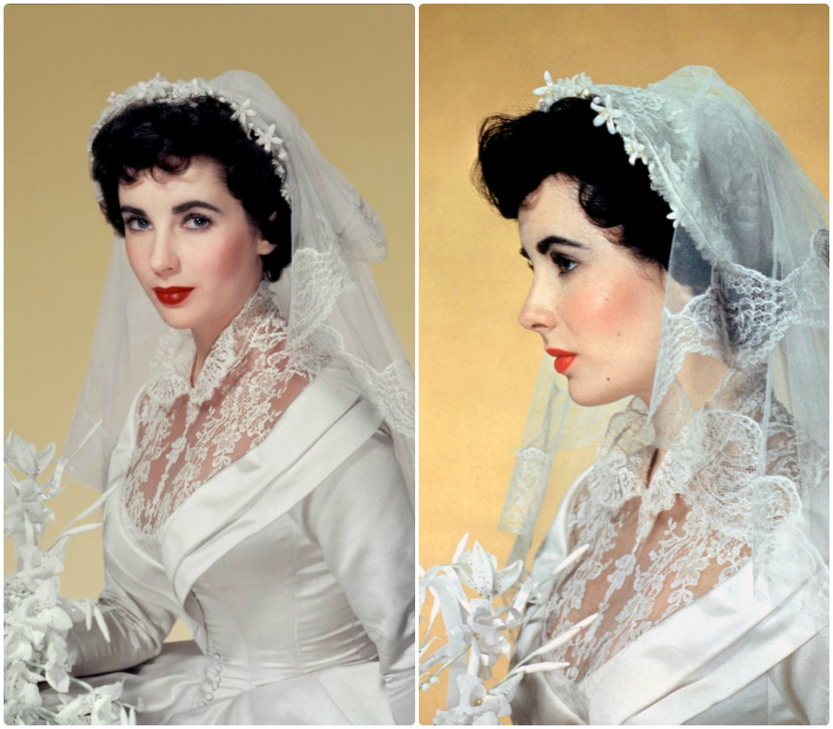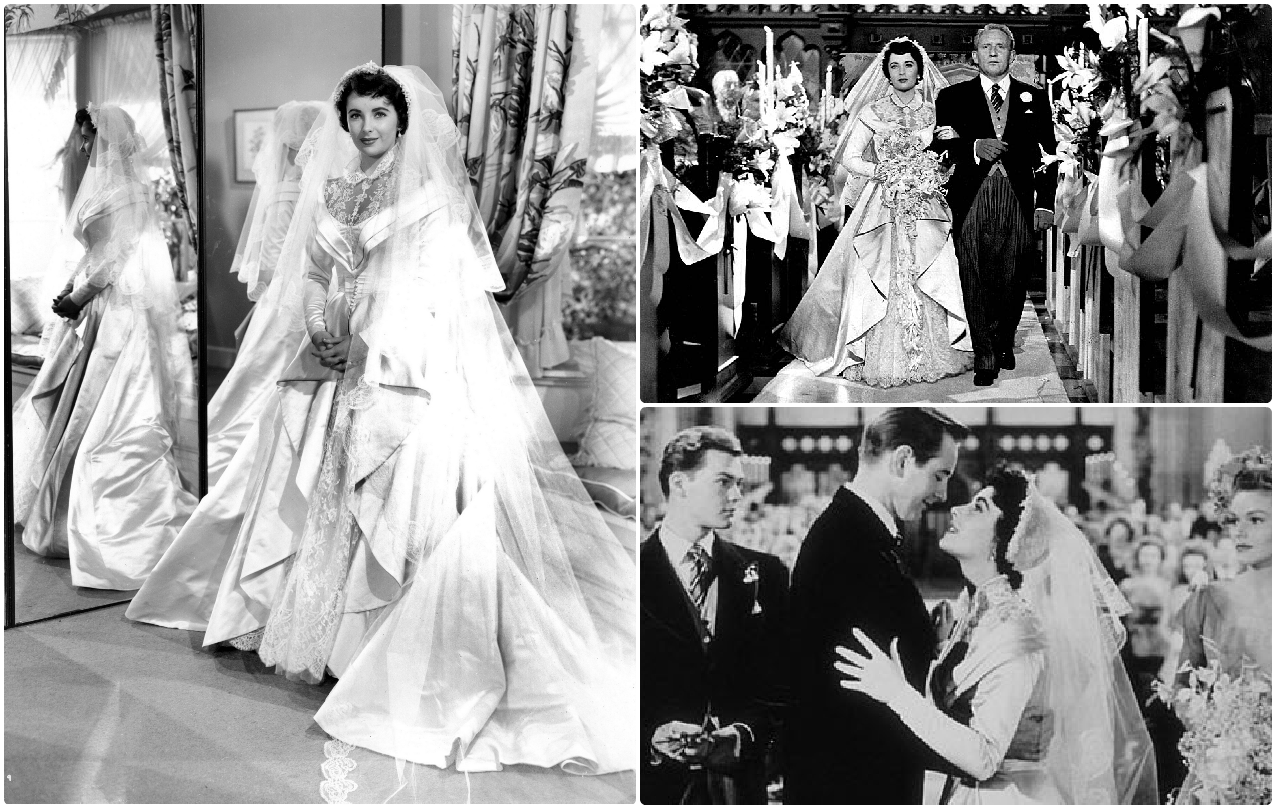 Слева Элизабет Тейлор в роли Кэй в фильме «Отец невесты» (1950). Справа Элизабет Тейлор в день своего бракосочетания 6 мая 1950 года.