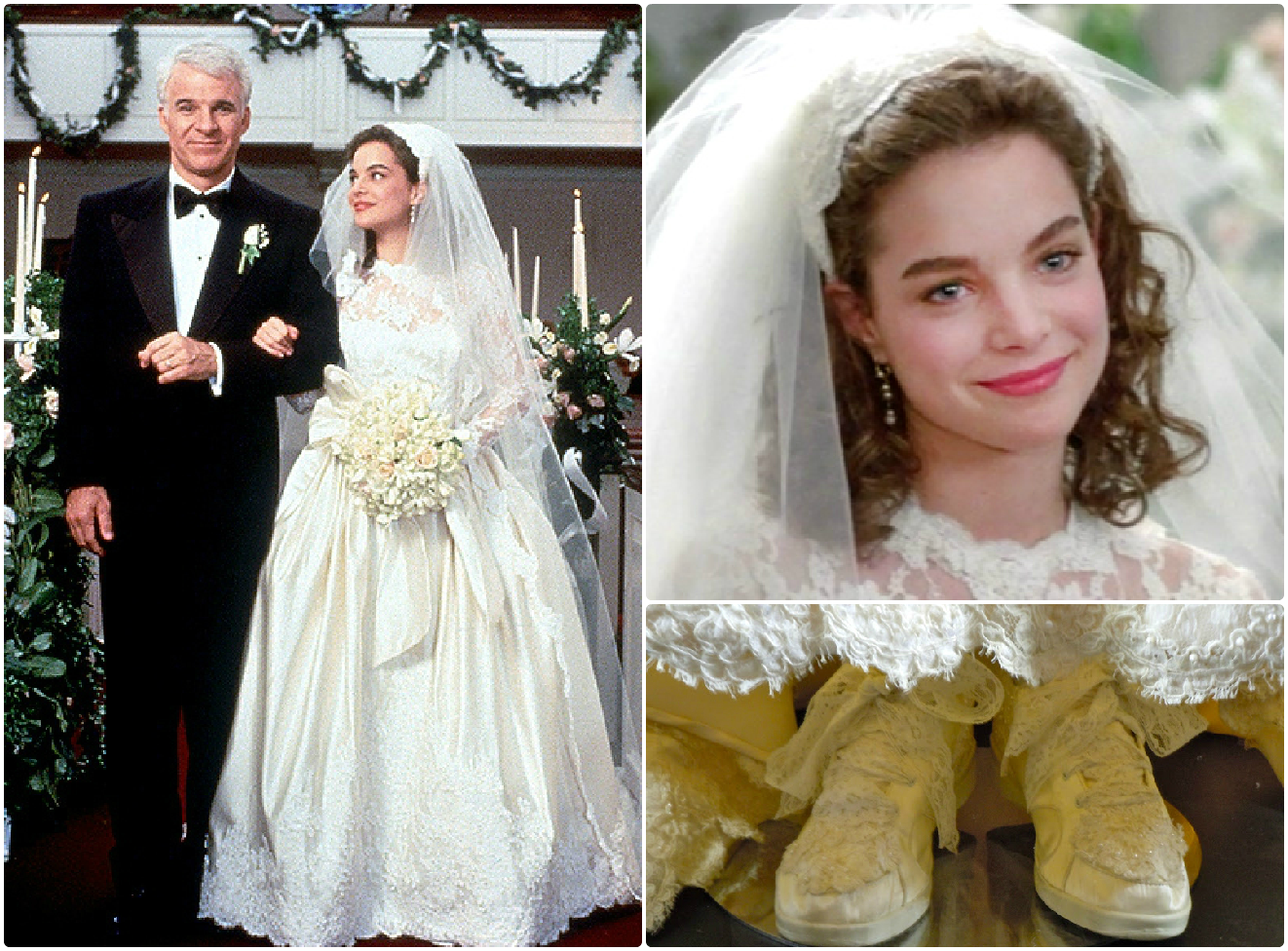 В 1991 году в Голливуде решились сделать ремейк всеми любимой классической ленты. К слову, фильм оказался на редкость удачным. Критики особо отмечали блестящую игру Стива Мартина в роли любящего отца, обескураженного новостью о грядущем замужестве дочери. Для Кимбирли Уильямс роль невесты стала дебютной и, как оказалось, самой заметной в ее актерской карьере. Уильямс — конечно девушка симпатичная, но сравнение с юной Лиз явно не в ее пользу. Свадебный наряд образца 1991 года соорудила художник по костюмам Сьюзен Бекер. И если платье с длинными кружевными рукавами и лифом выдержано в классическом стиле и фактически является осовремененной версией платья из оригинального фильма, то вот выбор свадебной обуви — это уже кое-что новое. Создатели ремейка решили сделать отца невесты не адвокатом, а владельцем небольшой компании по производству спортивной обуви. И в столь знаменательный для всей семьи день герой в качестве подарка любимой дочери преподнес ей отделанные кружевом и жемчугом белоснежные «свадебные» кроссовки.