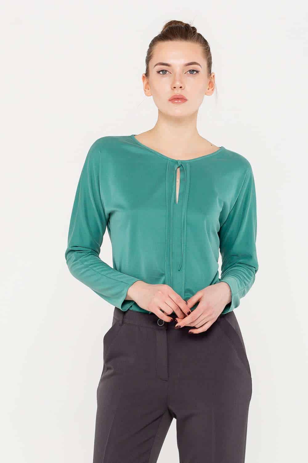 Удлиненный вырез горловины привлечет внимание к груди и визуально «вытянет» силуэт. Блузы с круглым воротником тоже подойдут, особенно варианты с глубоким вырезом