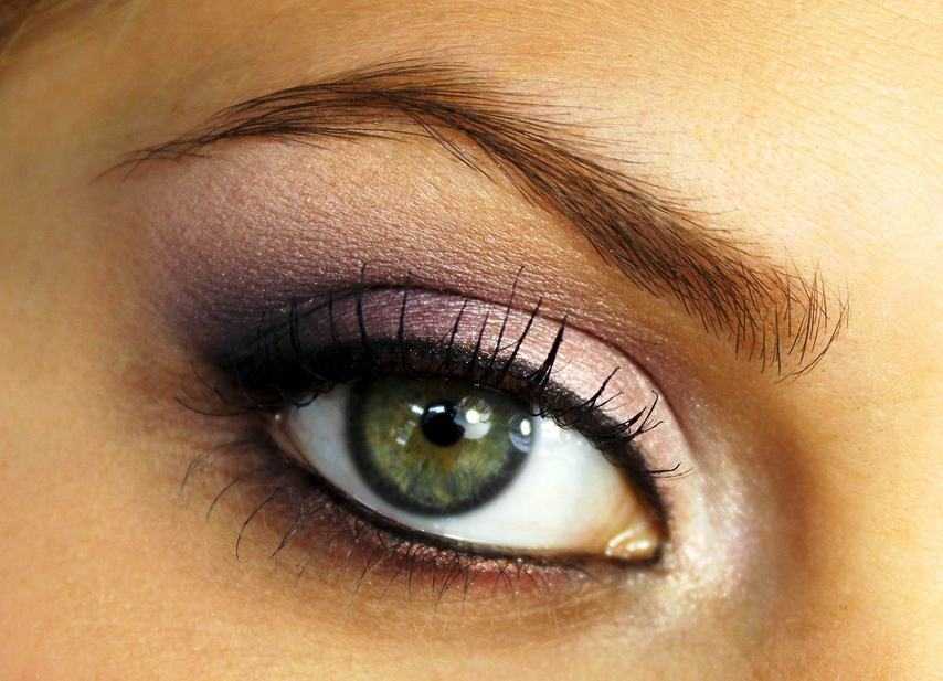 Мягкие шоколадные оттенки, тени с пурпурными и желтоватыми вкраплениями помогут превратить светло-серые очи в зеленые.