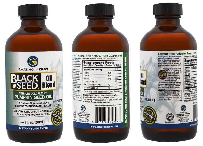 Растительный продукт от бренда Amazing Herbs выпускается в жидком виде в упаковке объемом 240 мл. В одной порции (1 ст. л. = 14 г) содержится 7 г экстракта тыквенных семечек и 7 г масла черного тмина. Имеет сертификат качества GMP, без глютена.