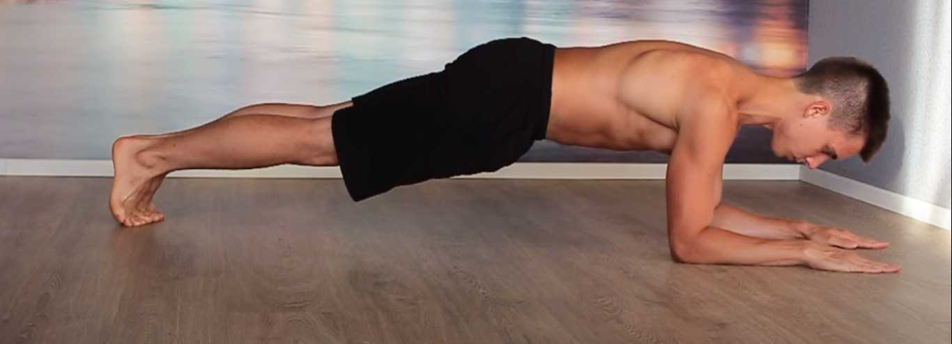 - Лягте на живот и положите ладони на пол. Выпрямите ноги и упритесь носками.
