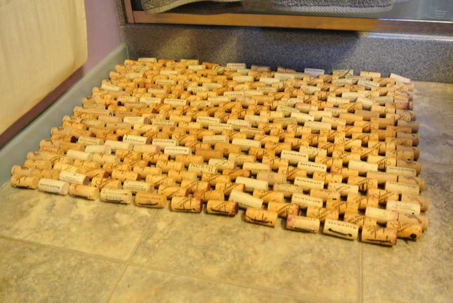 6. Коврик для ванной несложно сделать из винных пробок. Необходимо картонное основание, клей и большое количество пробок.