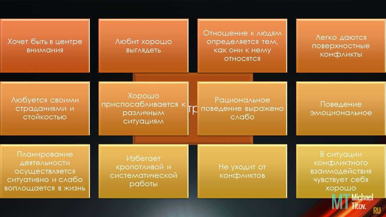 В поведении руководствуется эмоциями, избегает кропотливой деятельности. В конфликтах чувствует себя как рыба в воде, не пытается их сбежать, наоборот – сделает так, чтобы конфликт состоялся и на него обратили как можно больше внимания.
