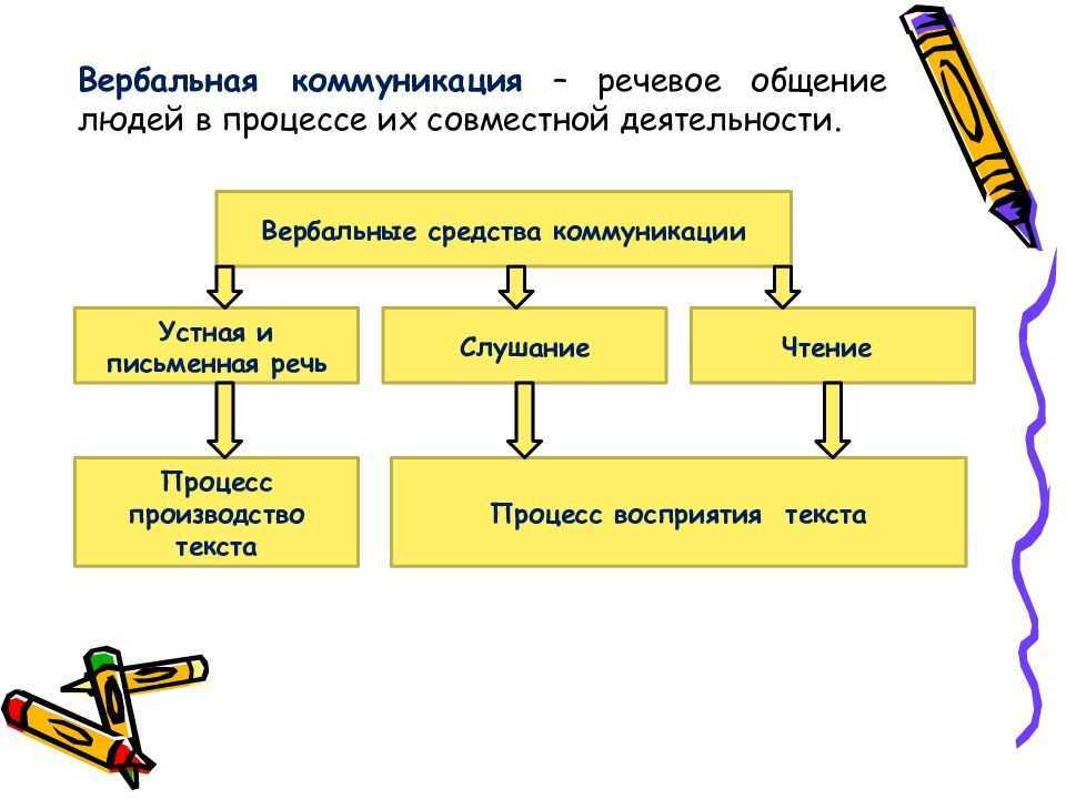 Вербальное общение осуществляется с помощью устной и письменной речи, реализуемой посредством языка.