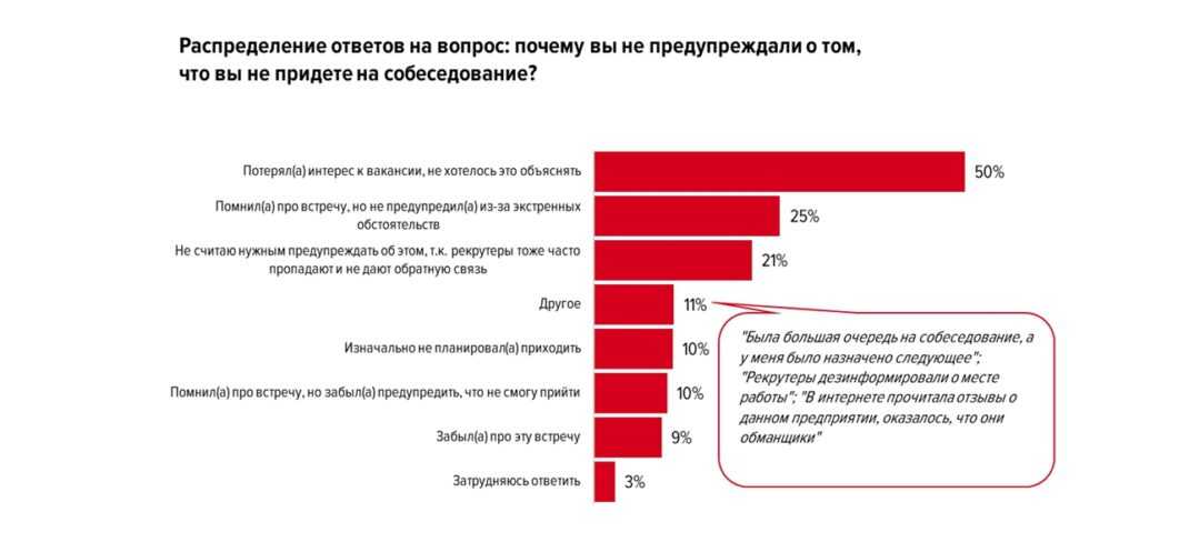Но самый интересный ответ — «Не считаю нужным предупреждать об этом, так как рекрутеры тоже часто пропадают и не дают обратной связи». Так ответил 21% респондентов, не являвшихся на собеседование. Так что в каком-то смысле соискательский гостинг — своеобразная «месть» за обиды, накопившиеся в процессе поиска работы.