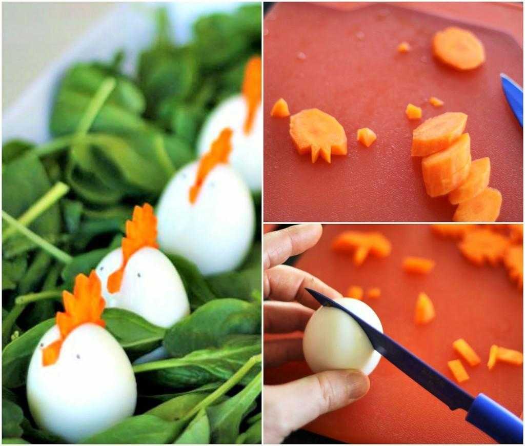 Желательно, чтобы яйца сочетались по вкусу с ингредиентами, входящими в состав салата. Идеально это украшение для салатов с яйцами, например, таких как оливье либо зимний салат. Мы предлагаем украшение из яиц для слоеного салата из овощей (свекла и морковь), сыра, грецкого ореха.