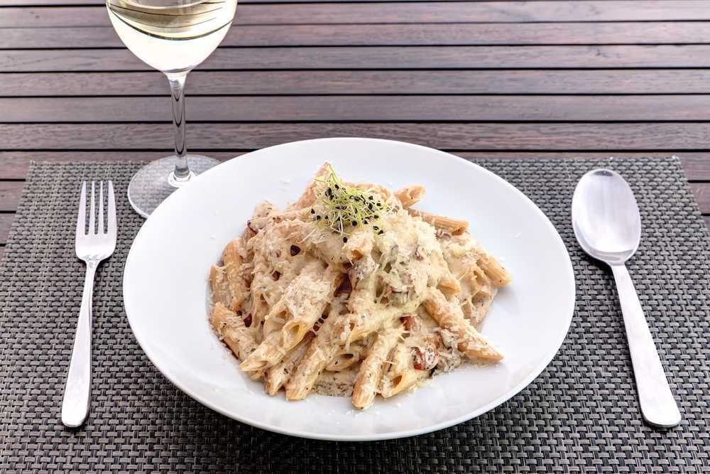 - Смешать в одной емкости (можно в кастрюле, где варились макароны) все ингредиенты, залить соусом и перемешать. В принципе, можно есть сразу, но мы рекомендуем выложить получившуюся массу в форму для выпечки и отправить в разогретую до 200 градусов духовку на минут 10 – так получится наряднее и ароматнее.