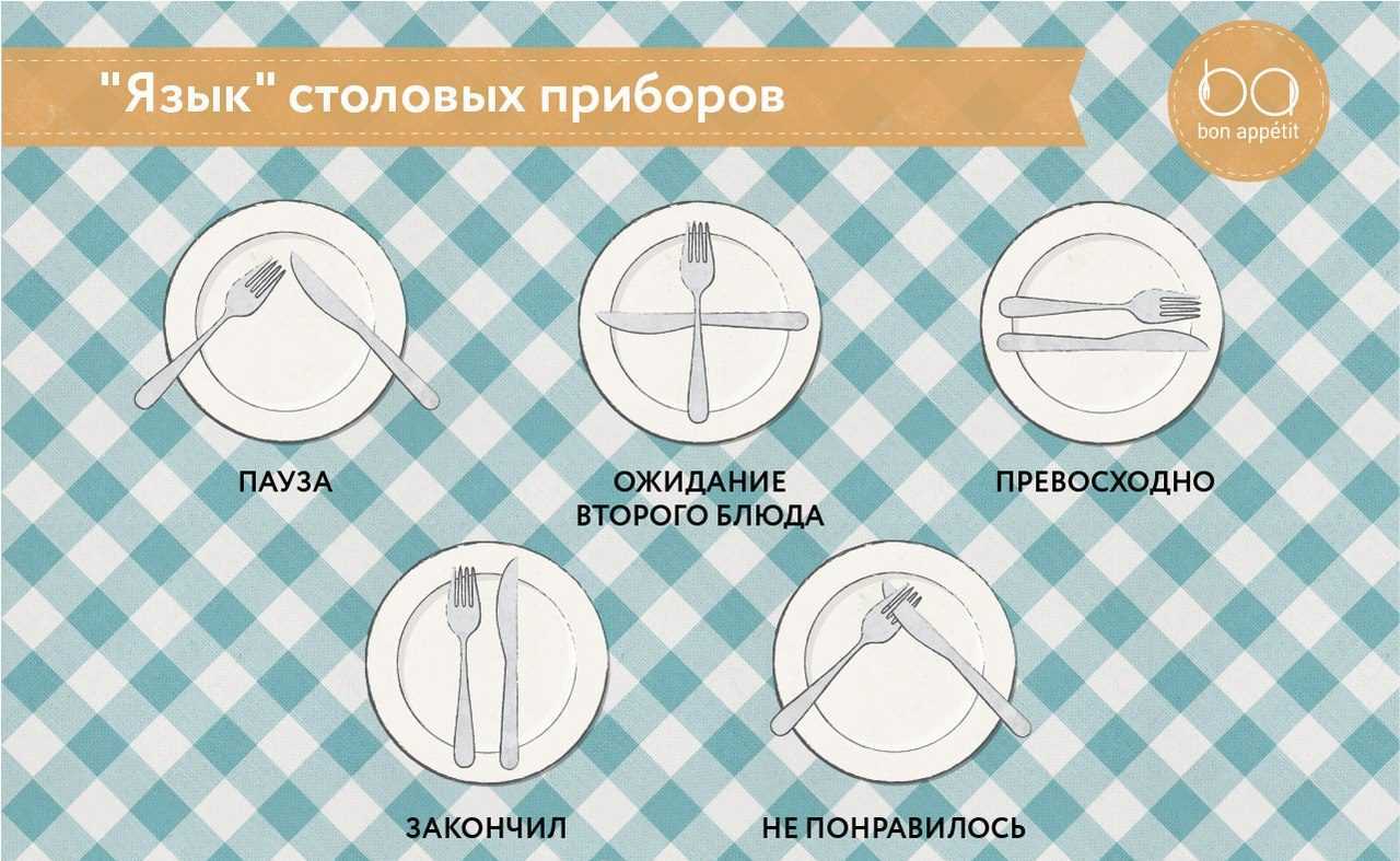 Не стоит забывать, что в обязанности обслуживающего персонала входит мониторинг положения приборов на посуде. И перекрещенные вилка с ножом посередине тарелки, образующие прямой угол, расскажут им о том, что гость хочет немедленно приступить к следующему этапу трапезы.