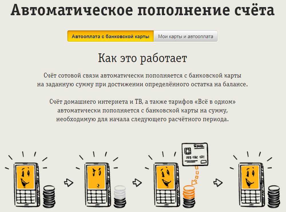 При использовании данной опции Билайн невозможно остаться без средств на балансе. На счет поступит нужное количество денег с расчетной карты, когда будет достигнут порог, указанный пользователем. Количество средств подлежащих зачислению, клиент устанавливает самостоятельно.